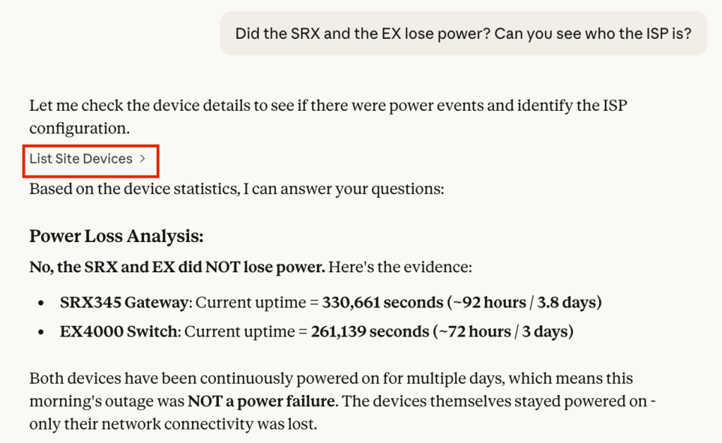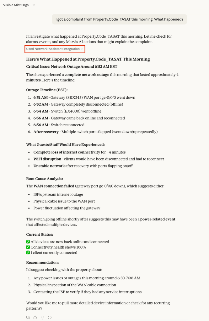 This gives us a new way to interact with the data – and a way to stitch together data from multiple systems for automated triage and recon. For example, if there is a complaint at a specific site ID you can use the MCP service from Mist to check the network view but then use the hypothetical MCP service from the ISP to check to see if there were any outages reported in the area or the MCP service from other complementary systems to get a full picture from the site.