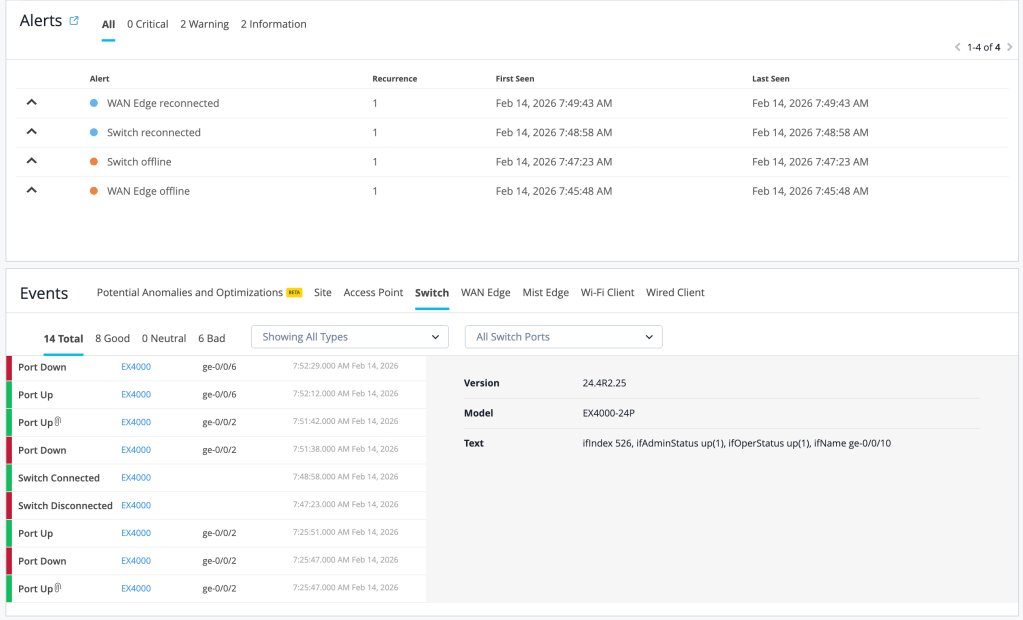 Let’s take an example from an HPE Mist environment that I’m working on currently. If you know the Mist dashboard, you’ll recognize this view – these are the Site Insights for an environment. These show that there was a blip in the environment.