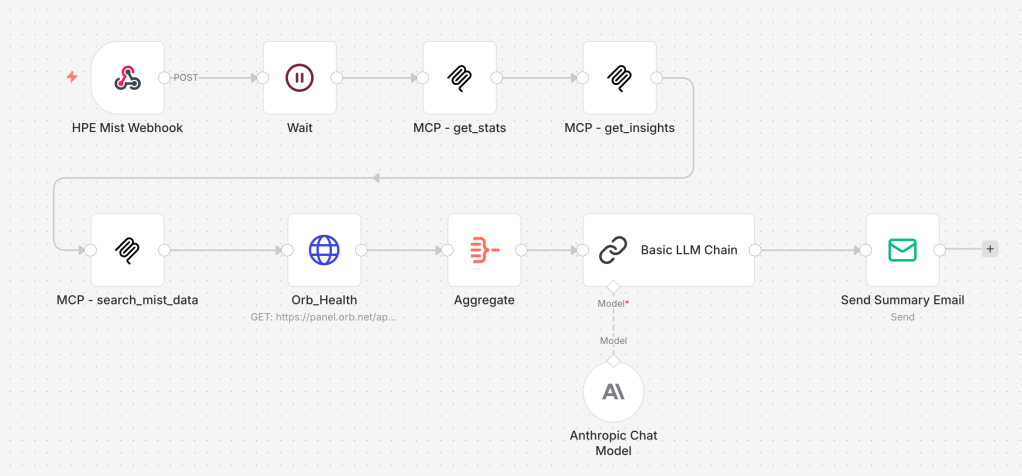 The webhook from Mist triggers the automatic triage process. n8n waits for a minute and then gathers data at the site, looking for events, stats, and other metrics. It then also does a check against the Orb API to see how healthy the clients are – in other words, cross-referencing multiple sources of data to see how the AP going offline has impacted client experience. All of this is then fed to an LLM with instructions to perform the analysis.