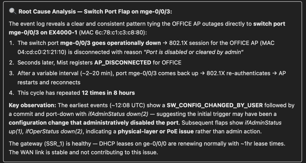 You can see that we’ve taken one of the most simple alerts – an AP going offline – and turned it into something actionable. The initial investigation has been automated.