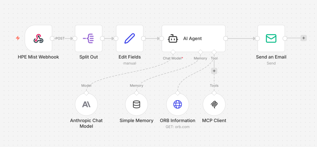In this example I’ll be combining Mist with Anthropic, n8n, and Orb. n8n is a low-code platform that makes it easy to stitch together automation workflows. Orb is an exciting new project founded by network measurement veterans that continuously measures latency, packet loss, jitter and internet speed. Anthropic provides the LLM to sift through the data and provide recommendations.